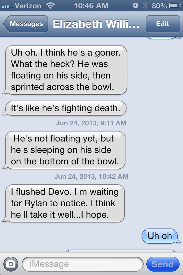 Sadly, this will be the last post in the Trilogy of the Fish. It started here when we were given two fish (Siggi and Devo) over the weekend. Next, things escalated quickly when Siggi really did go “swimming with the fishes.” Then, yesterday I got the following texts from my wife.