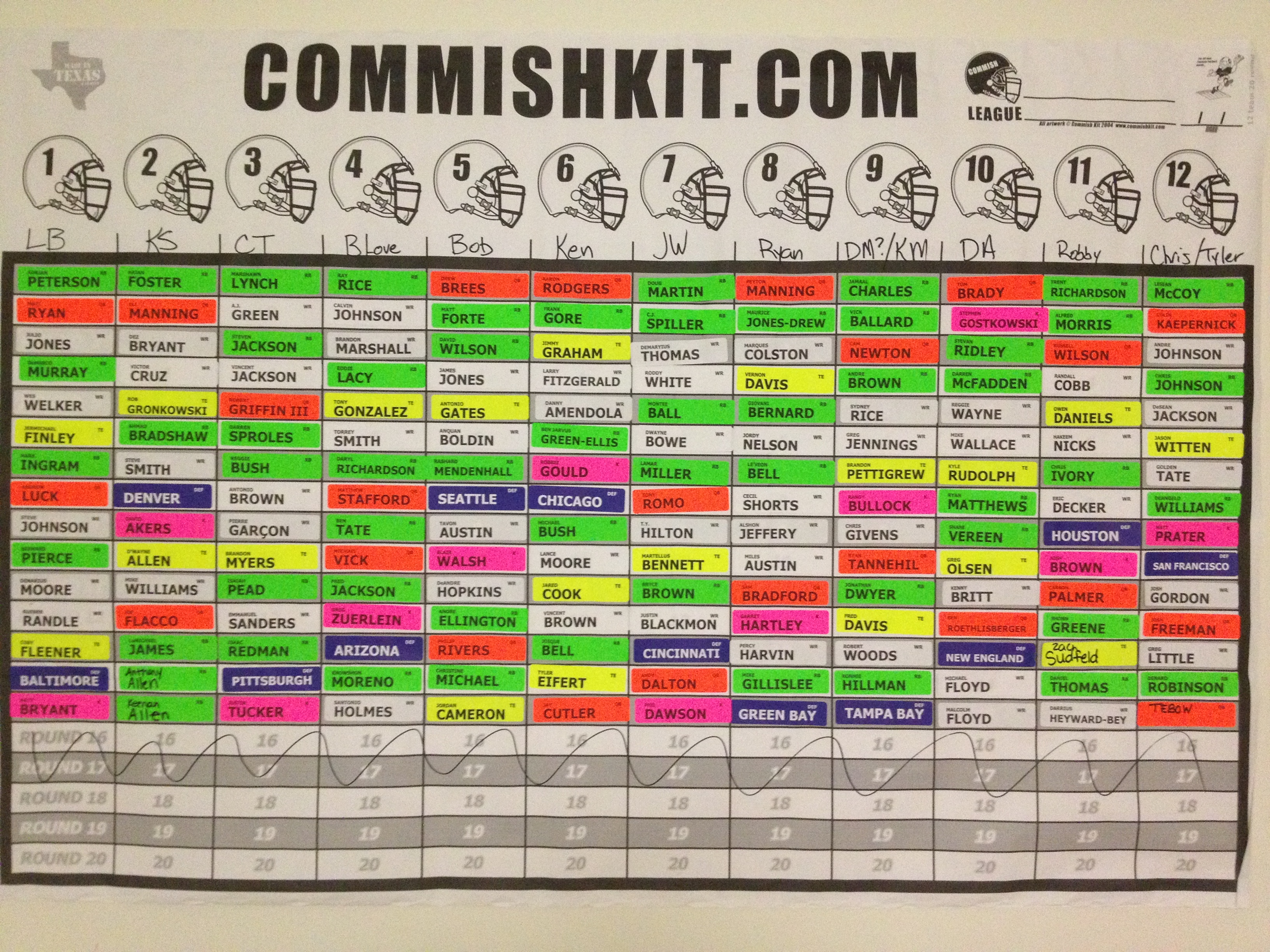 I think most fantasy football players will agree that our favorite time of the year is the draft.  There’s nothing like a live draft.  All your buddies sitting in a room filled with unhealthy snacks for hours at a time while ribbing each other with each pick.  For years, I’ve been in multiple leagues and have at least one that drafts in person.  I usually buy a draft board, like the one pictured below.  There are color-coded stickers by position with every player’s name on it.  When it’s your turn, you grab the sticker of the player you want and put him on the big board.